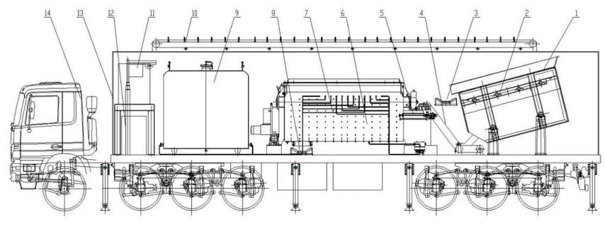 圖中:1、篩選機,2、破碎機,3、傳送帶,4、傾角輸送帶,5、雙道給料系統,6、攪拌離心機模塊,7、管路,8、可折疊式水平輸送帶,9、車載化學處理系統,10、車載輸送系統,11、監控系統,12、車載配電系統,13、車箱,14、運輸車。